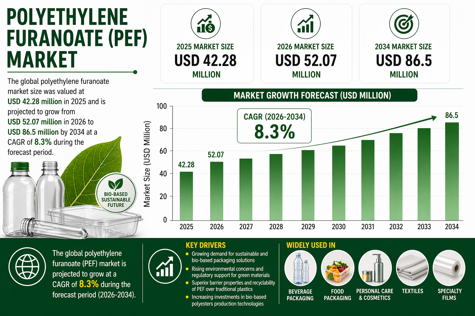 世界のポリエチレンフラン酸エステル市場規模は、2025年には4,228万米ドルと評価され、予測期間中の年平均成長率(CAGR)8.3%で、2026年の5,207万米ドルから2034年には8,650万米ドルに成長すると予測されている。