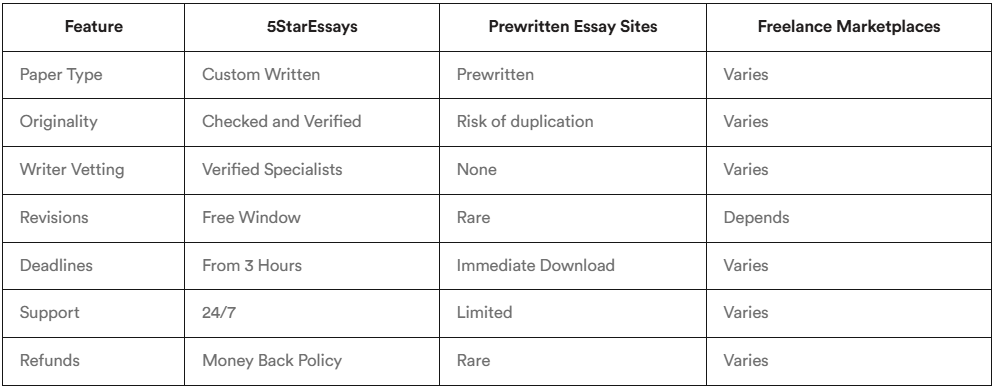 5StarEssays.com ensures every essay is unique, professionally written, and backed by a full support system—unlike prewritten or freelance options that risk low quality or plagiarism.