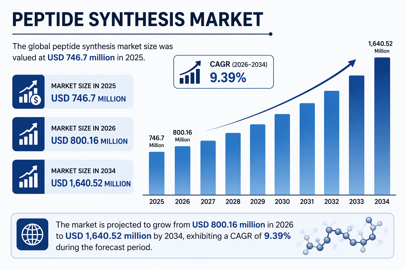 世界のペプチド合成市場規模は、2025年には7億4670万米ドルと評価されました。同市場は、2026年の8億16万米ドルから2034年には16億4052万米ドルに成長すると予測されており、予測期間中の年平均成長率(CAGR)は9.39%です。