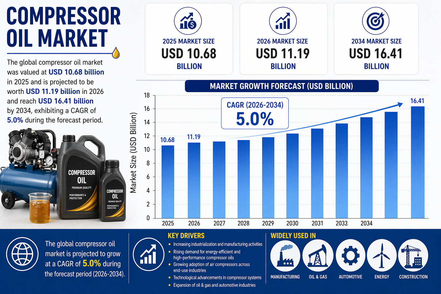 世界のコンプレッサーオイル市場は、2025年には106億8000万米ドルと評価され、2025年には111億9000万米ドルに達すると予測されており、2034年には164億1000万米ドルに達し、予測期間中の年平均成長率(CAGR)は5.0%となる見込みです。