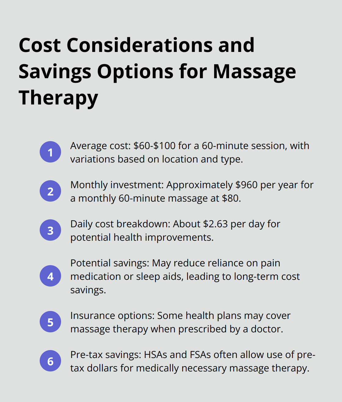 Massage therapy isn't just a luxury - it's preventative healthcare that could save you money long-term. When you compare the cost to prescription medications, physical therapy, or chronic pain management, those monthly sessions start looking like a bargain. Your body is your most important investment. Why not treat it like one?