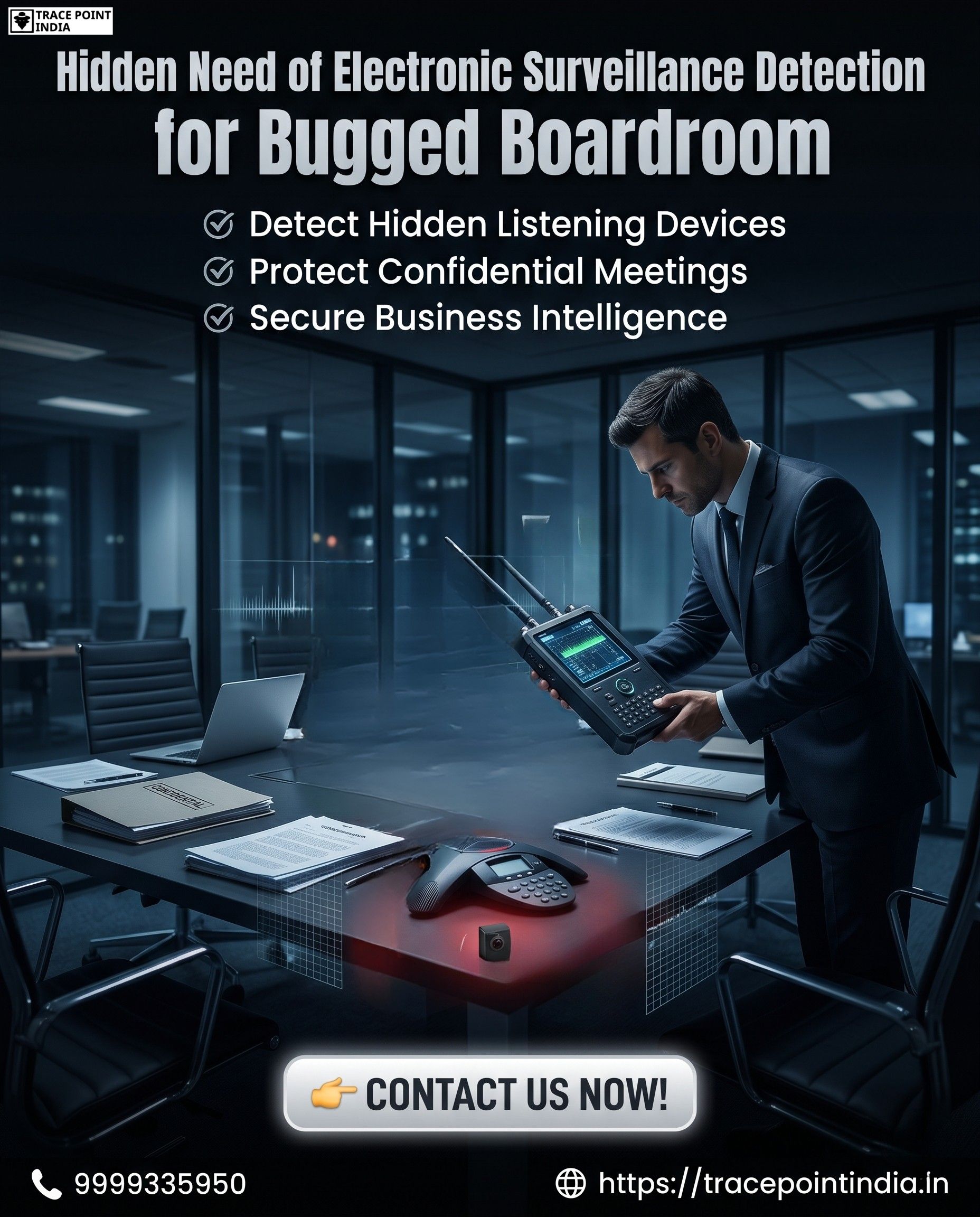 Don't let a hidden microphone dictate your company's future or ruin your competitive advantage. Trace Point India provides elite, military-grade bug sweeping services (TSCM) to completely sanitize and secure your most sensitive corporate environments. Take control of your boardroom and protect your intellectual property today!