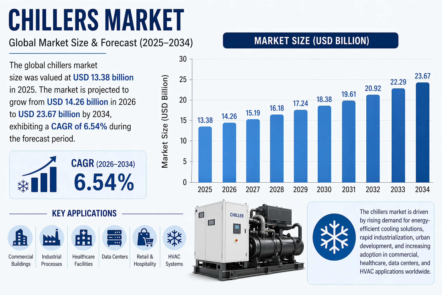 世界のチラー市場規模は、2025年には133億8000万米ドルと評価されました。市場規模は、2026年の142億6000万米ドルから2034年には236億7000万米ドルに成長すると予測されており、予測期間中の年平均成長率(CAGR)は6.54%です。
