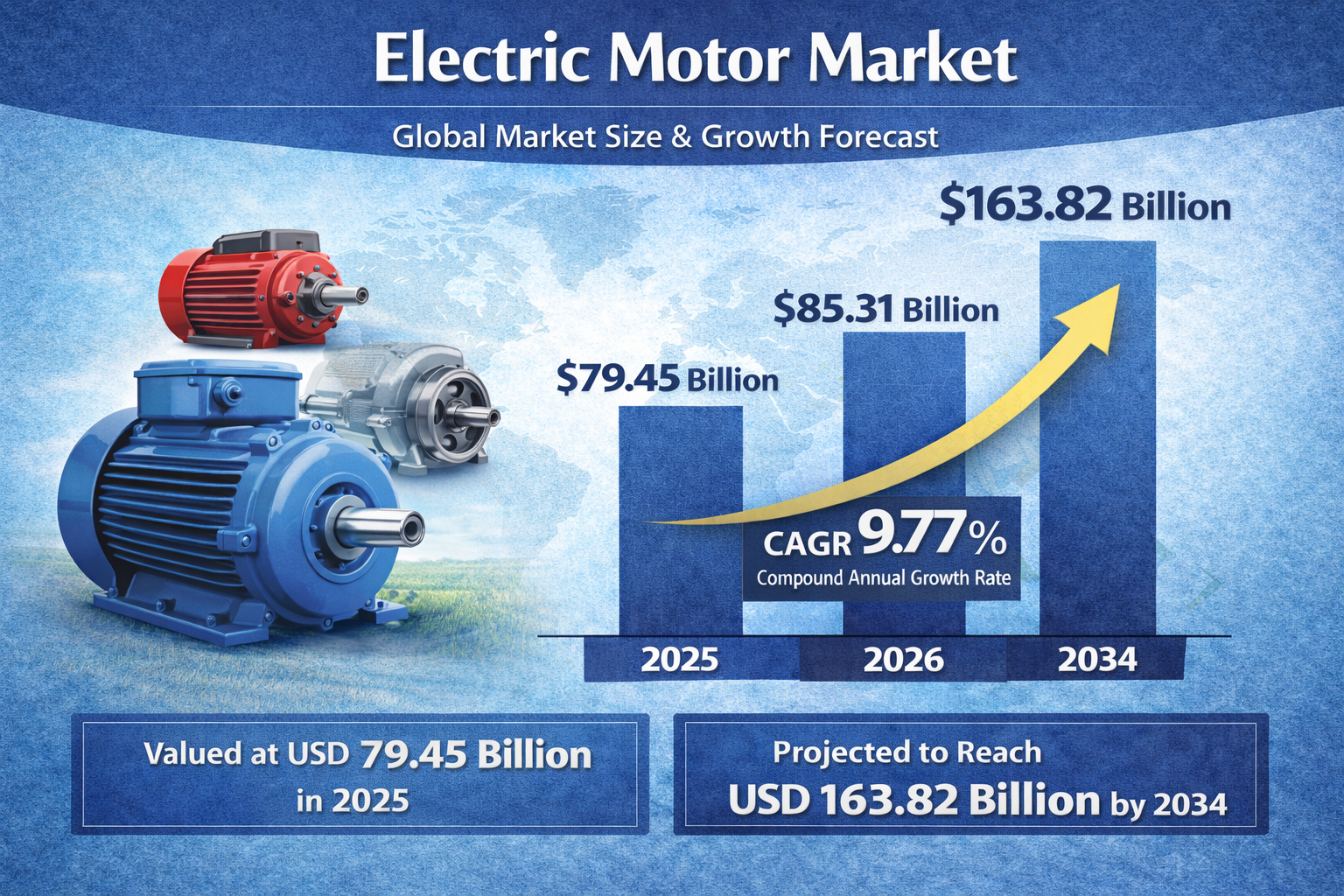 世界の電気モーター市場規模は、2025年には794億5000万米ドルと評価され、2026年の853億1000万米ドルから2034年には1638億2000万米ドルに成長すると予測されており、予測期間中の年平均成長率(CAGR)は9.77%となる見込みです。