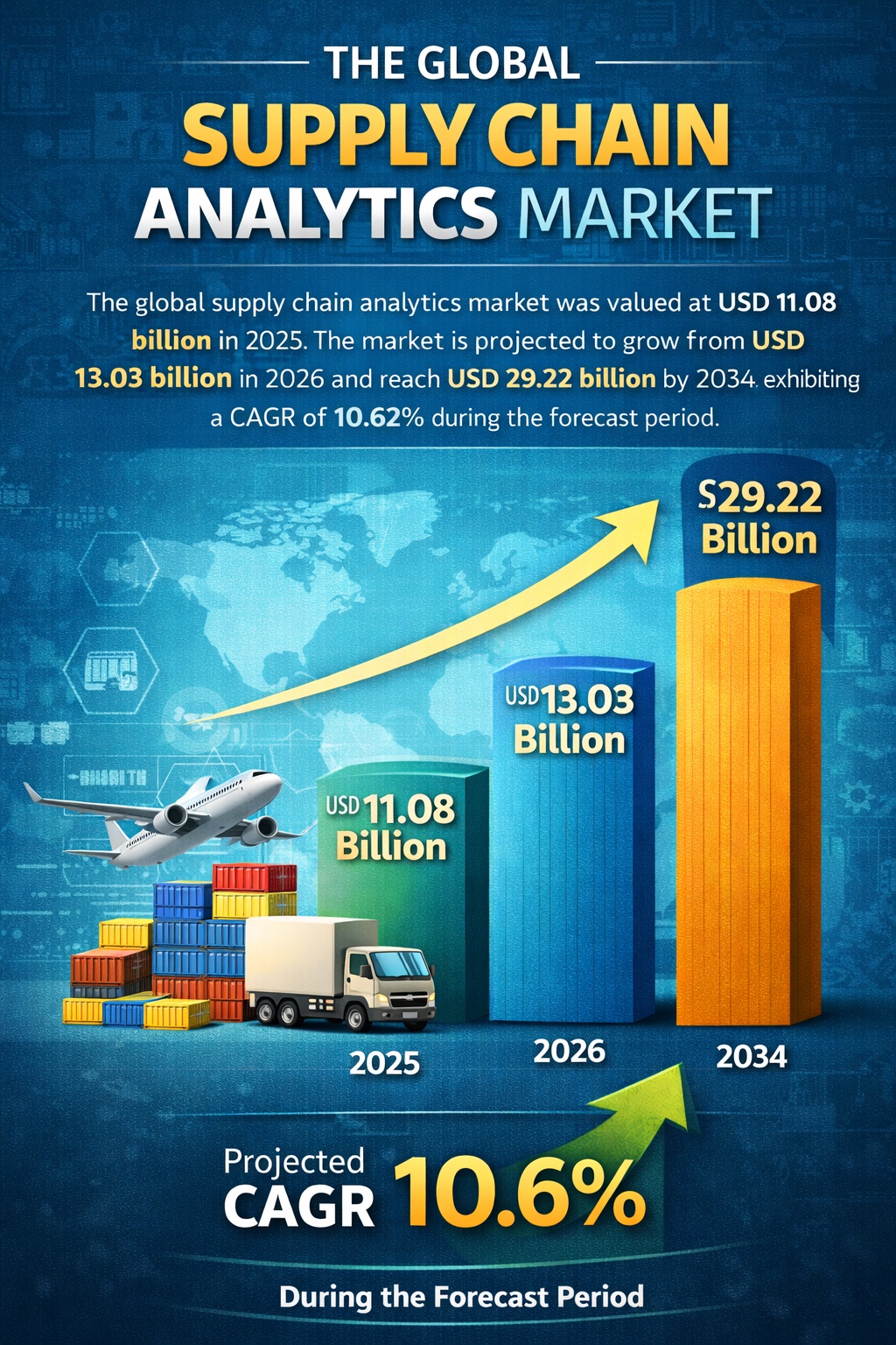 世界のサプライチェーン分析市場は、2025年には110億8000万米ドルと評価されました。同市場は、2026年の130億3000万米ドルから成長し、2034年には292億2000万米ドルに達すると予測されており、予測期間中の年平均成長率(CAGR)は10.62%です。