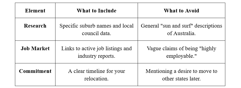 You should avoid generic praise about Australia and focus specifically on the state nominating you. Mention specific regional growth areas, major infrastructure projects, or industry hubs that align with your ANZSCO code. For example, if you are an engineer applying for South Australia, referencing the defence or renewable energy sectors shows you understand where the state is investing.