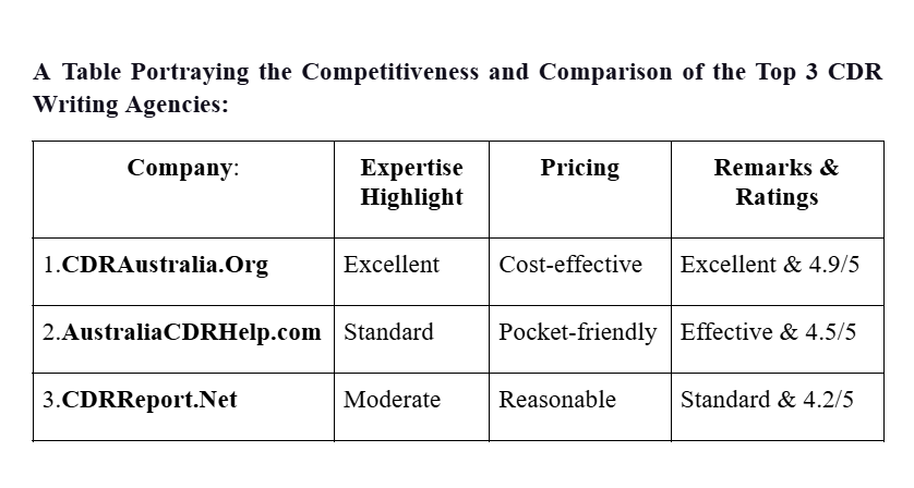 Summarily, all three CDR writing agencies are arranged and discussed based on their impact, wide presence, and credibility. Thus, these are top helpers, deliver assistance to enhance and ensure a candidate's approval for skilled immigration. They have the ability to turn an ordinary report into a compelling one. Candidates can choose the platform as per their specific needs, including affordability, urgency, timeframe, and expectations.