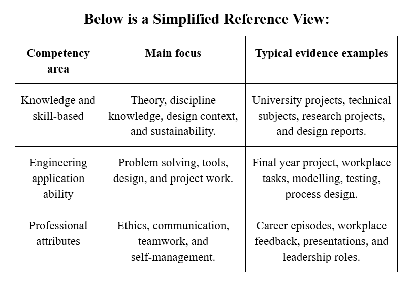 - Knowledge and Skill Base- Covers engineering fundamentals, specialist discipline knowledge, and application of theory to practice.