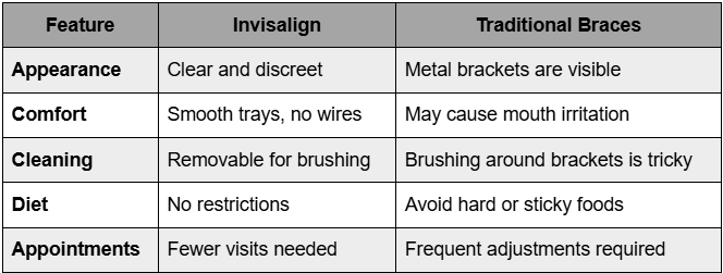 The table below highlights the key differences between Invisalign and conventional braces, helping parents understand why many families lean towards clear aligners for their children.