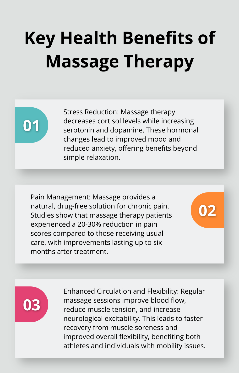 Natural Pain Relief Research from the Annals of International Medicine found massage patients experienced 20-30% pain reduction that lasted six months. That's real, measurable relief without popping pills.