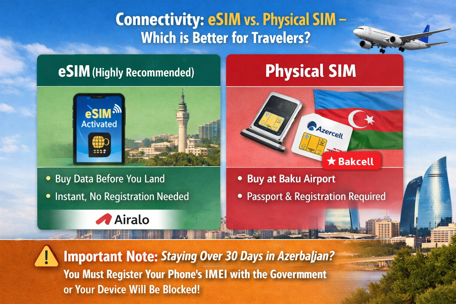 - Important Note: If you stay in Azerbaijan longer than 30 days, you must register your phone's IMEI with the government, or the local network will block your device.