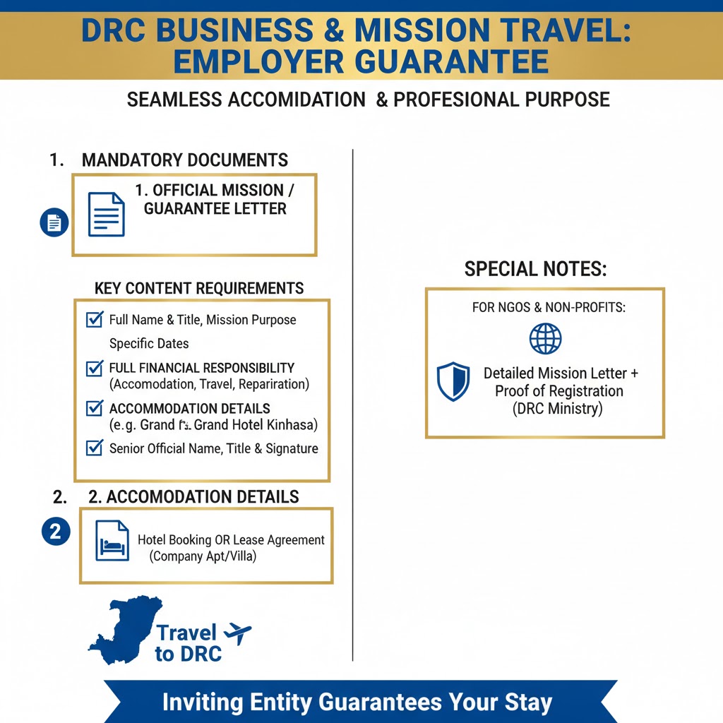 For those traveling to the DRC on an official mission or for extended business activity, your accommodation proof must be seamlessly linked to your professional purpose and guaranteed by the inviting entity.