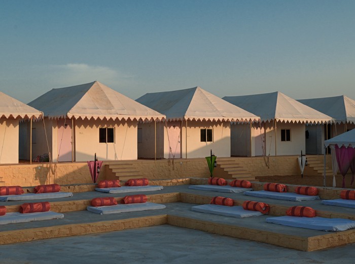 The luxury tent in Jaisalmer is elegantly decorated with traditional Rajasthani furniture and intricate artwork, offering guests an authentic and sophisticated experience. The suites feature elaborate patterns and rich colors, providing an indulgent atmosphere for relaxation. King-size beds and luxurious bathrooms adorn each camp, guaranteeing complete comfort. Additionally, the camp boast beautiful views of the surrounding area, creating a tranquil and peaceful ambiance. Guests can enjoy a lavish stay while immersing themselves in the culture and nature without compromising on comfort.